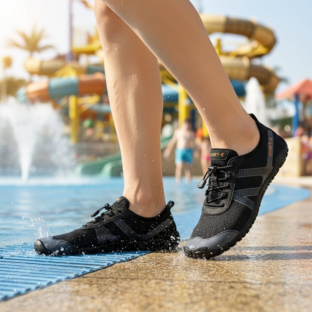 🔹 Suela antiderrapante con drenado rápido – Orificios en la suela para evacuar el agua eficientemente y evitar resbalones.